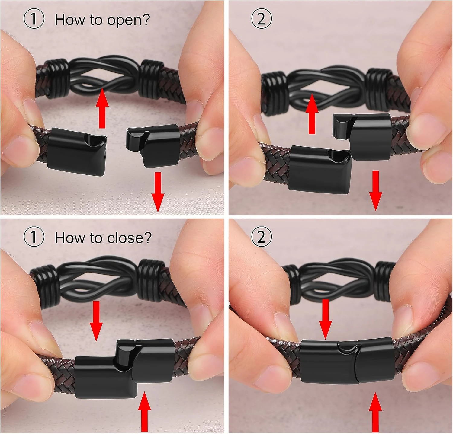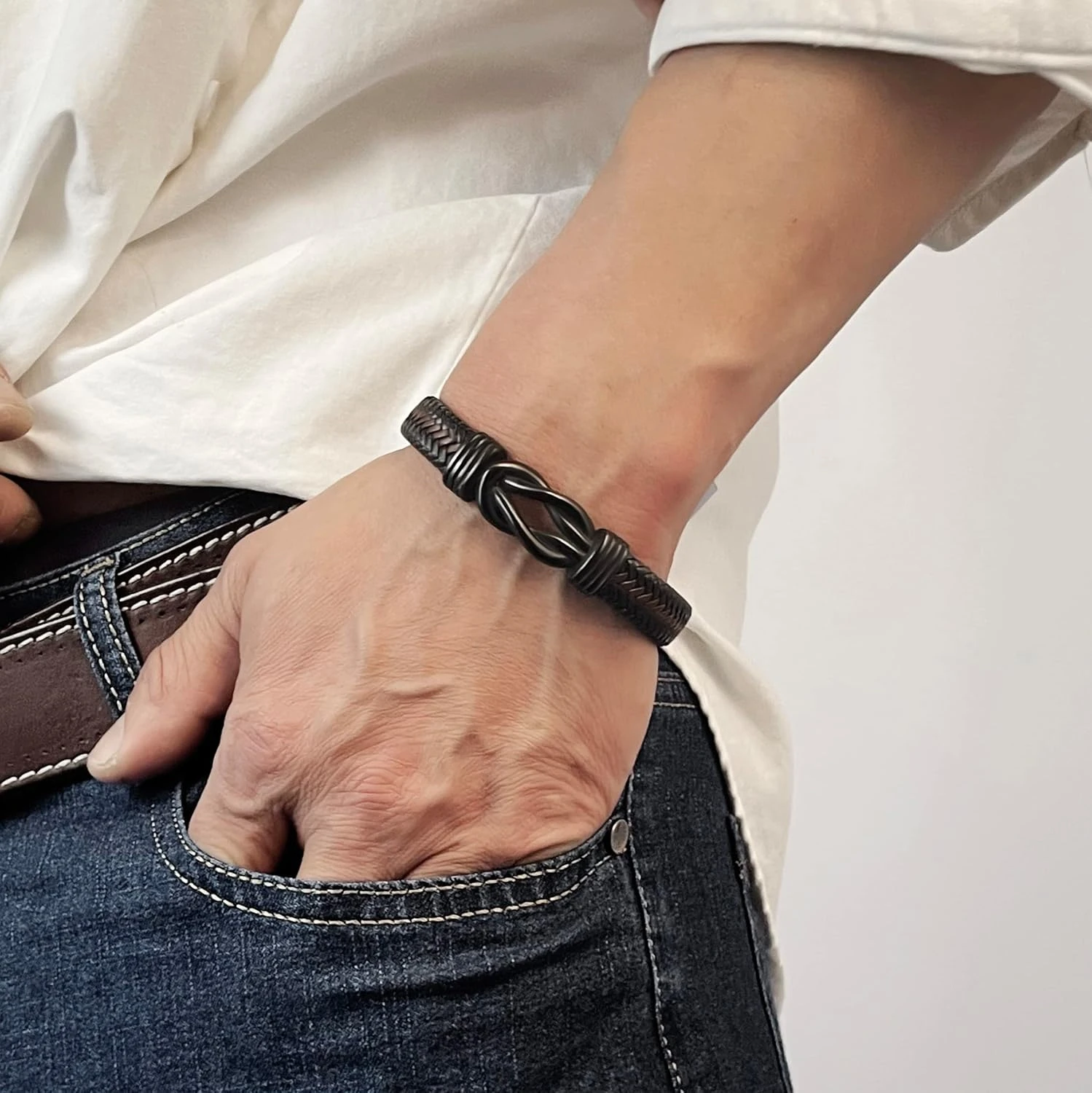- Mens Brown Bracelets en cuir: Fait de cuir de haute qualité et des matériaux en acier inoxydable.Le bracelet tissé à la main est étroitement tissé avec une boucle en acier inoxydable durable spéciale. Fermoir interne spécial, fente et arrangement d’épingle, facile mis dessus sans tomber.