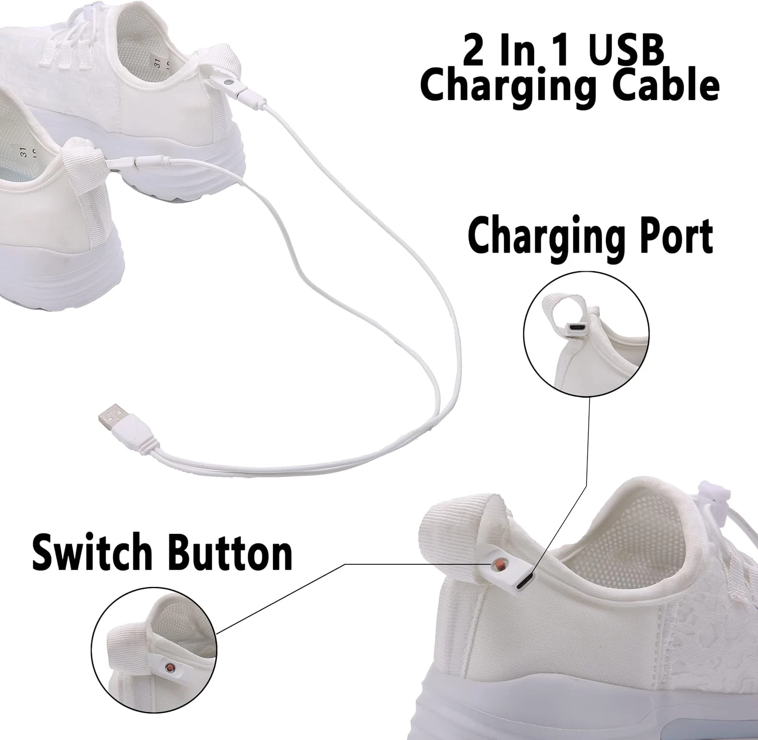 - Switch And Charging Instruction – Le commutateur et le bouton de charge de ces baskets à led sont cachés dans la sangle arrière de la chaussure. Appuyez dessus pour allumer. À chaque pression, il passe à un autre mode d’éclairage. Appuyez sur l’interrupteur pendant 12 fois pour éteindre la lumière, ou continuez à appuyer pendant 3 secondes pour éteindre la lumière.