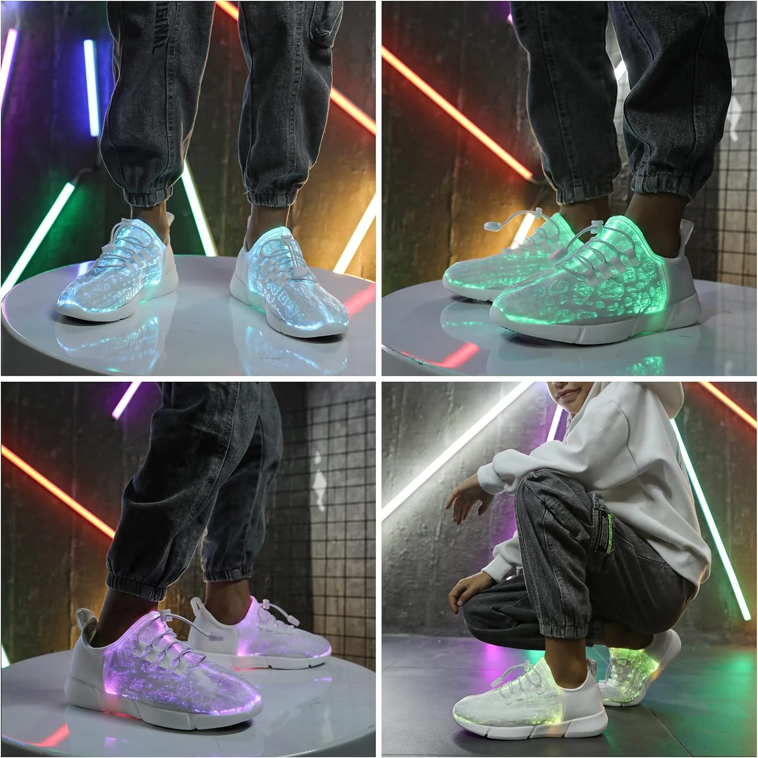 - Trendy And Funny Sneakers – Ces baskets lumineuses ont 7 modes de couleurs claires statiques et 4 modes de lumière dynamique, qui vous transforment en enfant cool. Surtout la nuit, fête d’Halloween, veille de Noël, Nouvel An, fête d’anniversaire.