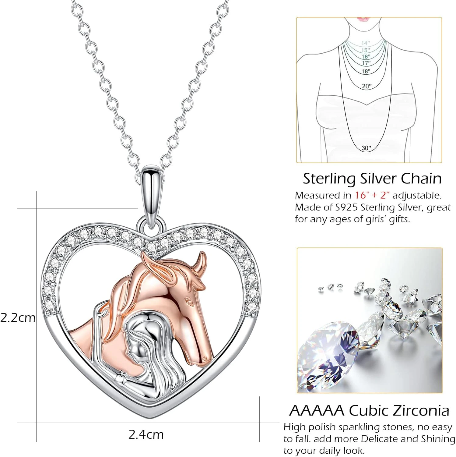 - 💖Horse Collier Taille – Coeur cheval pendentif Taille: 2.4cm x 2.2cm | Longueur de la chaîne: 40cm+5cm (16″+2″) extender | High polish pétillant AAAAA Cubic Zirconia, vous obtiendrez beaucoup de minet de ce collier de cheval pour les filles, adapté pour les filles, les femmes et les adolescents!
