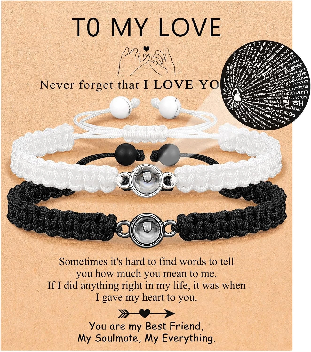 - 【Couples Bracelets】– Ces bracelets de correspondance gravés avec « Je t’aime dans 100 langues différentes ». Vous pouvez trouver le secret caché en tenant le charme rond près de vos yeux. Comme il est doux quand vous voyez je vous aime dans 100 langues différentes!